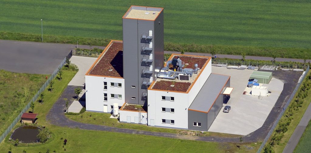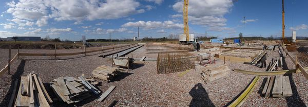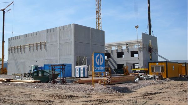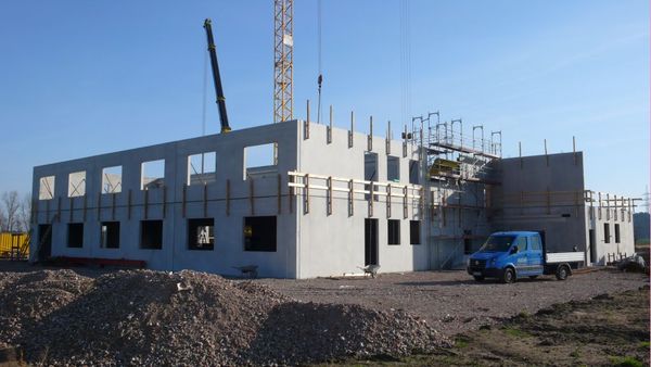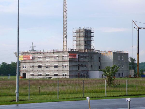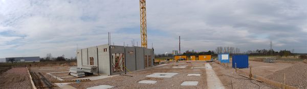 Da die Produktions- und Bürogebäude aus Fertigbetonteilen hergestellt werden schreitet der Bau schnell voran. Diese Woche soll noch das Dach geschlossen werden. Anschliessend sind der Turm und der Innenausbau dran.